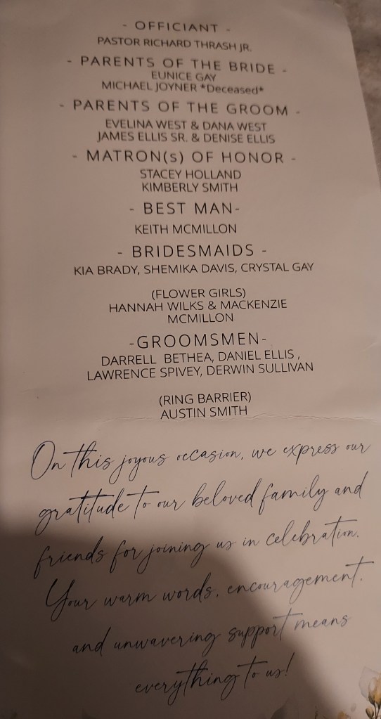 The bride, Angela Gay, is the daughter of Dr. Eunice Gay and the late Michael Joyner. Angela is the granddaughter of the late Lucille Gay Blow and the great-granddaughter of the late Robert “Pa Bob” Gay and the late Lillie ” Ma Lillie” Parker Gay.